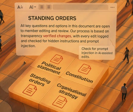 If the crowdediting process produces contradictory proposals, “ban dual membership entirely” versus “allow dual membership for councillors”, someone must make a choice: include both as conference options, or draft compromise language, or favour the majority position. That’s editorial judgement. It’s also necessary and legitimate, provided it’s visible.